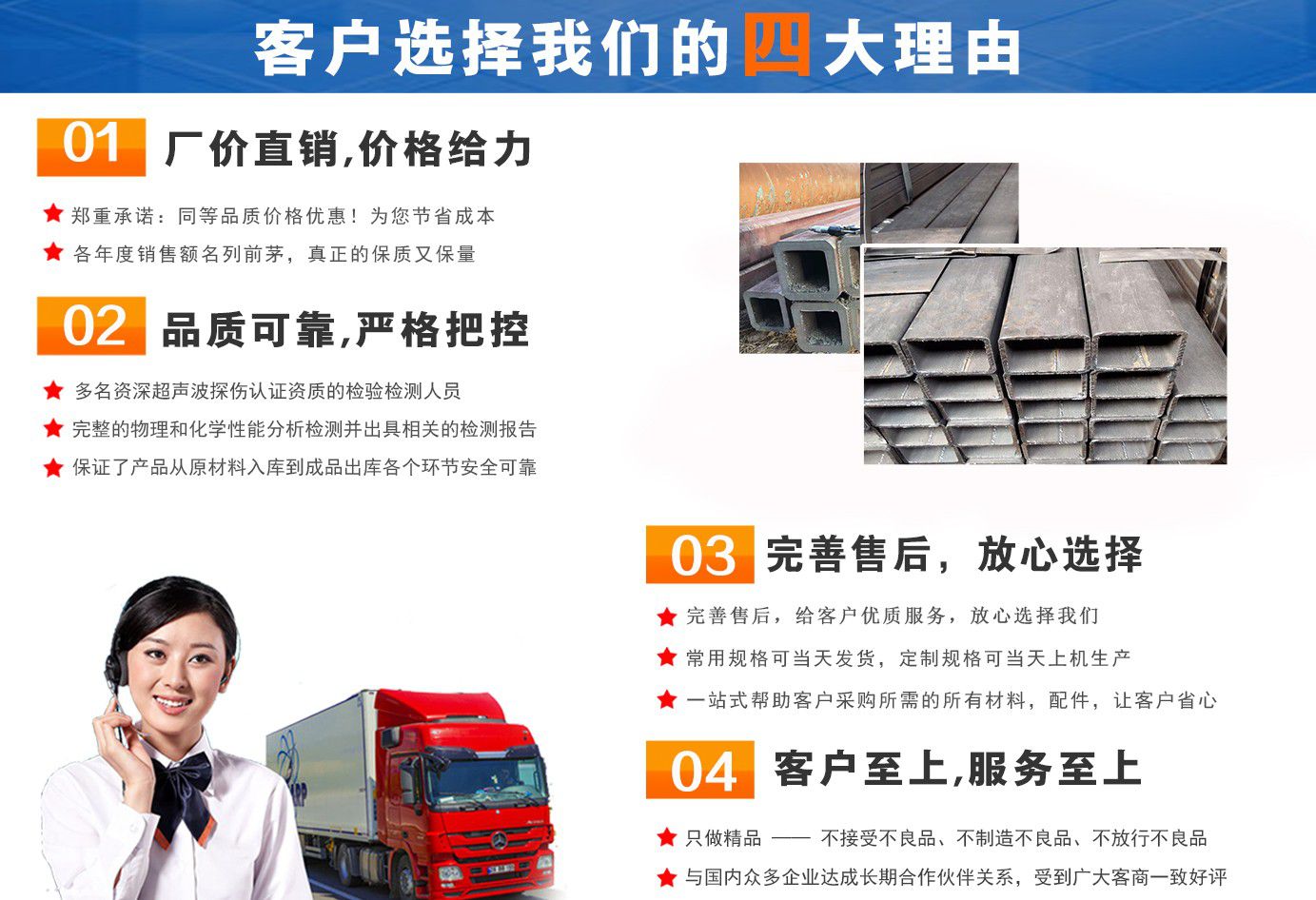 無錫盛灝特鋼有限公司長期銷售Q355B方矩管,鍍鋅方矩管,大口徑方矩管,厚壁方矩管,無縫方矩管等各種方管產品!產品廣泛應用于鋼結構建筑(鋼管混凝土、管樁、管桁架,橋梁、海上作業平臺、港口碼頭建設、電視通訊鐵塔、電力鐵塔等鋼結構管)。壓力管道(石油、天然氣、煤漿等輸送)、機械制輥等領域。  公司自創辦以來,一直堅持“誠信合作,共同發展”的經營理念?! ∫恢币詠砦覀儽局耙哉\相待,以信為本,互利互惠,共同發展”的長期方針,充分發揮現貨資源優勢為您提供“可靠的產品、過硬的質量、完善的服務”,歡迎廣大新老客戶前來洽談業務?! 」疽浴爸琳\至信,雙利雙贏”為根本宗旨,堅持科技興企的發展策略,恪守商規,創新進去,贏得聲譽,贏得了市場,得到了社會各階層的認可。公司以雄厚的實力、可靠的質量、儲存鋼管門類齊全、庫存量大之優勢,本著守法、守信、創新的理念,打造精品,發展鋼管多元化品種,滿足客戶各種需求,以低廉的價格、熱情的服務面向國內外客戶,歡迎鋼管界同仁加盟!我們為客戶提供周到的服務 !  公司為客戶提供以下服務  服務三保: 保證質量、保證時間、保證數量?! 》兆谥迹?雄厚的實力、優質的產品、低廉的價格、周到的服務?! ∨慵鏍I,一支起定。...